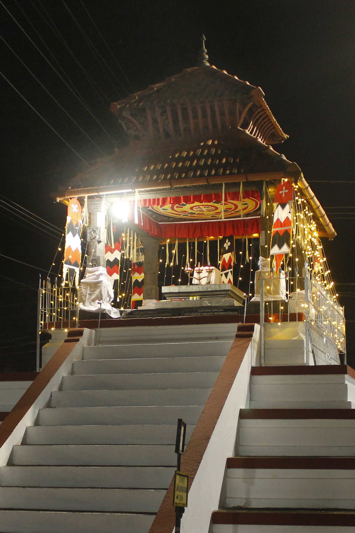 Sri Kizhur Maha Siva Temple locally known as “Kizhur Ambalam” near Payyoli in Kozhikode district is one of the most famous temples in North Kerala. Legend has it that ‘the Karanavor of Kaippurath Matriarchal family’ at Kizhur used to visit the Muchukunnu Kotta Temple situated miles away regularly for worship. However with the old age, the ‘Karanavar’ was finding the up and down journey to the temple more and more difficult. On a rainy day the “Karanavar’ due to his old age could not attend the temple. On that day the Holy ‘Sivachaithanyam’ was incarnated on the wooden pillar of his house in the form of ‘Agni’ (fire). One will observe that the sanctum sanctorum and mandopam are jointly built along with the carved wooden idol in the form of a pillar, which resembles the structure of old ‘Kalappura’. Legend has it that when the fire was lighted the door shut automatically. To this day, the main door of the Sreekovil remains closed. Darshan is possible only through the small opening on the right side of the closed main door. Priests also enter the Sreekovil through this small door.